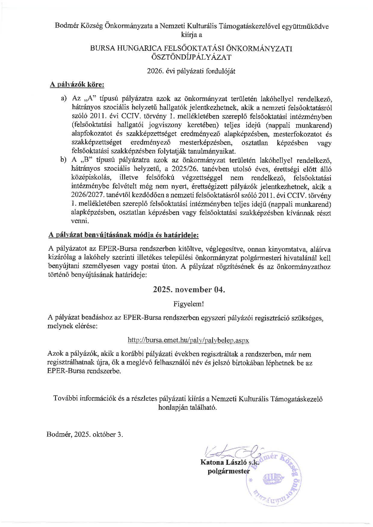 - személyesen (kedden 8.00 és 12.00 óra között) a polgármesteri hivatalba (Bodmér, Vasvári Pál u. 58.).